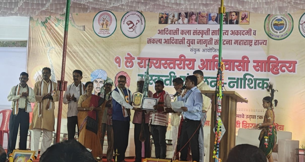पद्मश्री भिकल्या दिंडा यांच्या हस्ते कवी संतोष यांना “आदिसाहित्य पुरस्कार हेम्टू (अतिक्रमण) या आदिवासी पावरी हिंदी द्विभाषिक कविता संग्रहास पुरस्कार
