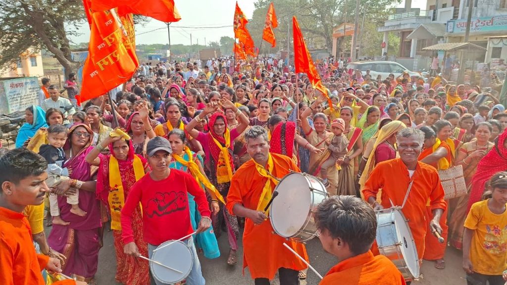 शोभायात्रेत सहभागी झालेल्या भाविक भक्तांनी हलगीच्या तालावर ठेका धरल्याचे दिसून आले. हलगी जसजशी वाजवण्यात येत होती तसतसे भाविक देखील उत्साहाने नाचत होते. यावेळी जय श्री रामाच्या जयघोष करण्यात आला.