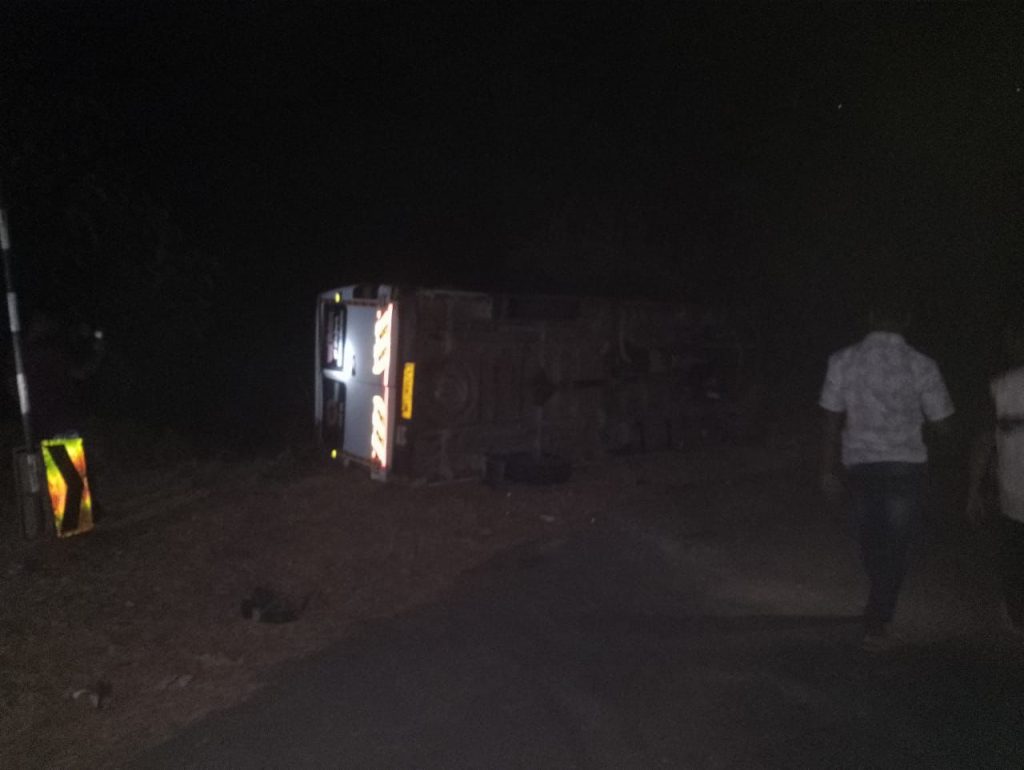 या टेम्पो ट्रॅव्हलर चा ब्रेक फेल झाल्याने गाडी उलटून झालेल्या अपघातात बसमधून प्रवास करणाऱ्या १८ प्रवाशांपैकी पाच जण किरकोळ जखमी झाले आहेत.