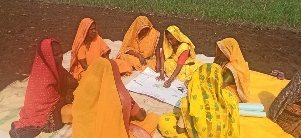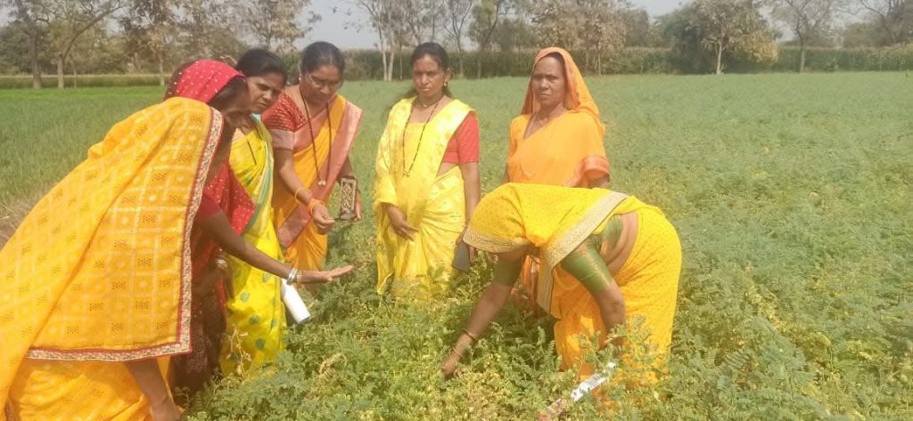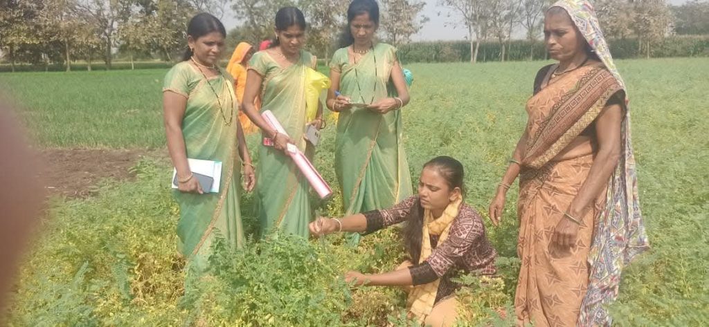 महिला शेतकरी प्रशिक्षणार्थींनी प्रत्यक्ष शेत निरीक्षण करून शत्रू व मित्र किडींचे संकलन केले आणि त्यावरील उपायांची माहिती घेतली.