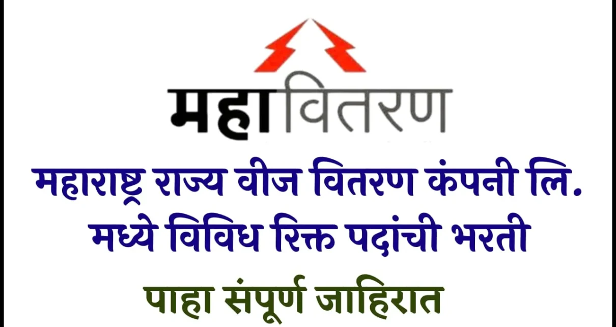 महाराष्ट्र राज्य वीज वितरण कंपनी लि. मध्ये विविध पदांच्या रिक्त जागा भरण्यासाठी भरती निघाली आहे. यांच्या अधिकृत संकेतस्थळावर प्रकाशित करण्यात आलेल्या जाहिरातीमध्ये पदानुसार पात्र असणाऱ्या उमेदवाराकडून ऑनलाईन पद्धतीने अर्ज मागवले जाणार आहेत. जाहिरातीमधील रिक्त असणारी पदे, त्याबद्दलची इतर आवश्यक माहिती, पदानुसार असणारी अर्जाची शेवटची तारीख, या संबंधित सर्व मजकूर खाली देण्यात आलेला आहे. कृपया तो वाचावा.